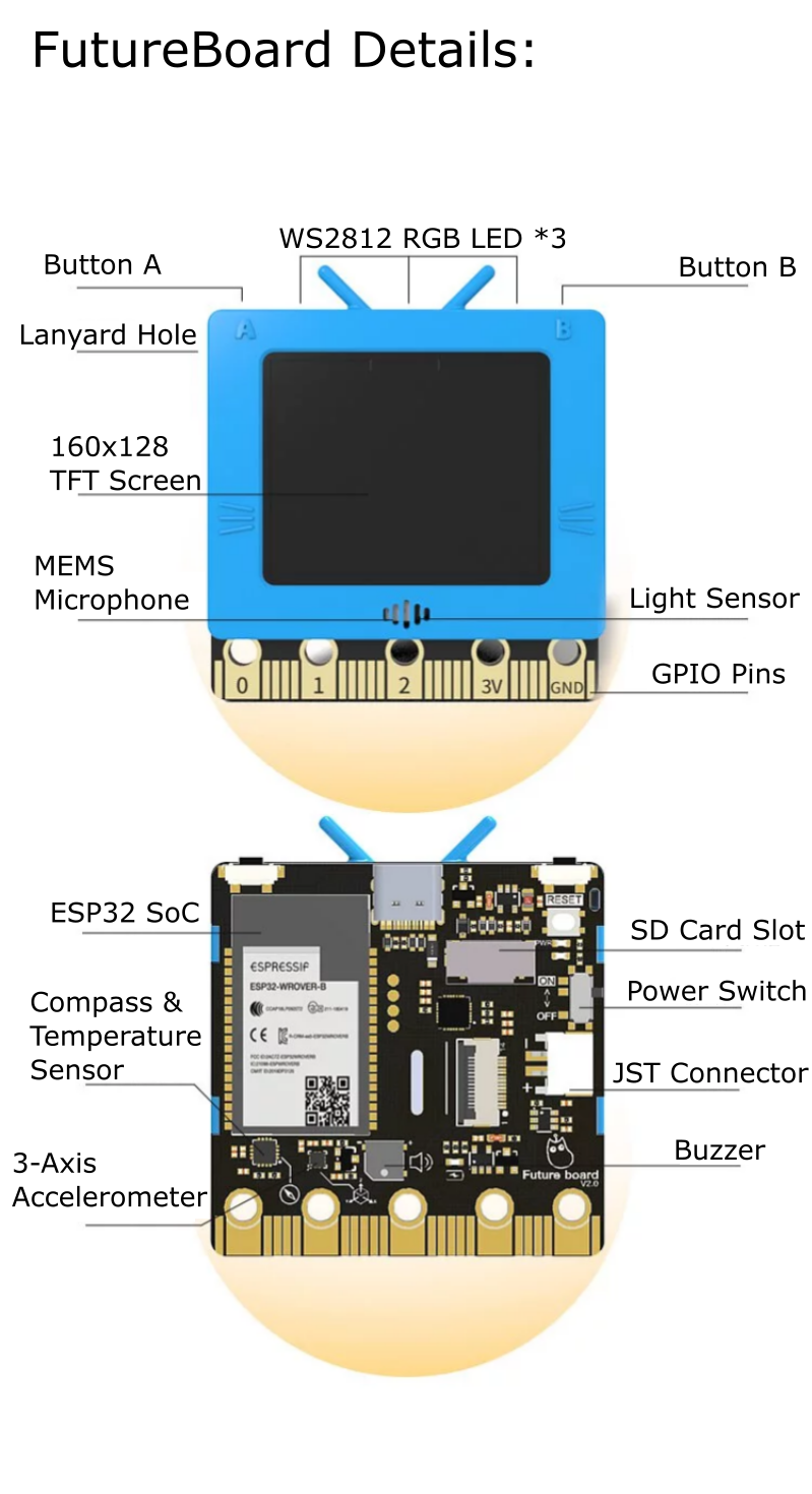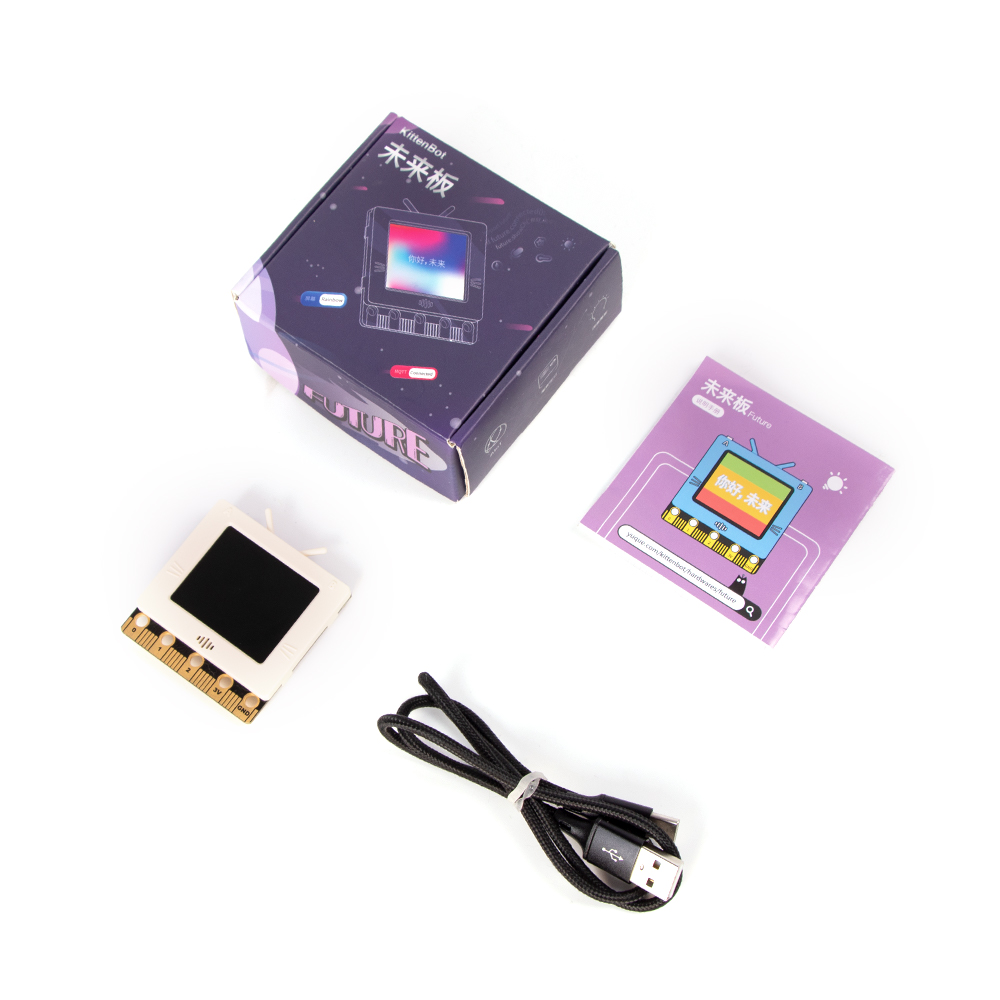 As the name suggests, FutureBoard is a main control board designed for STEM education in the future. It has many built-in sensors just like the Micro:bit, but unlike the Micro:bit, FutureBoard features a TFT screen capable of displaying full colors. This allows students to display information in real-time and to unlock even more potential for more interesting coding projects.