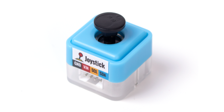This is a joystick module in the Sugar sensor series, it can detect joystick positions and trigger status. The pin holes on the back allow compatibility with plastic building blocks.